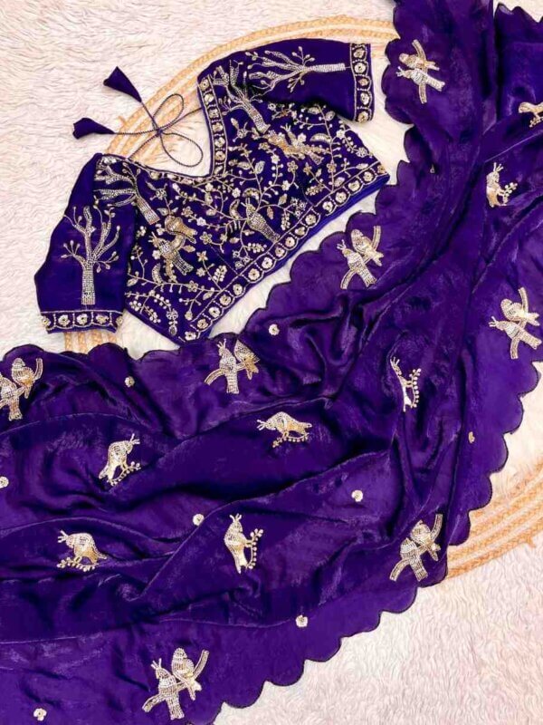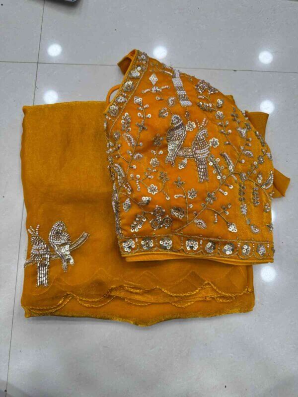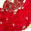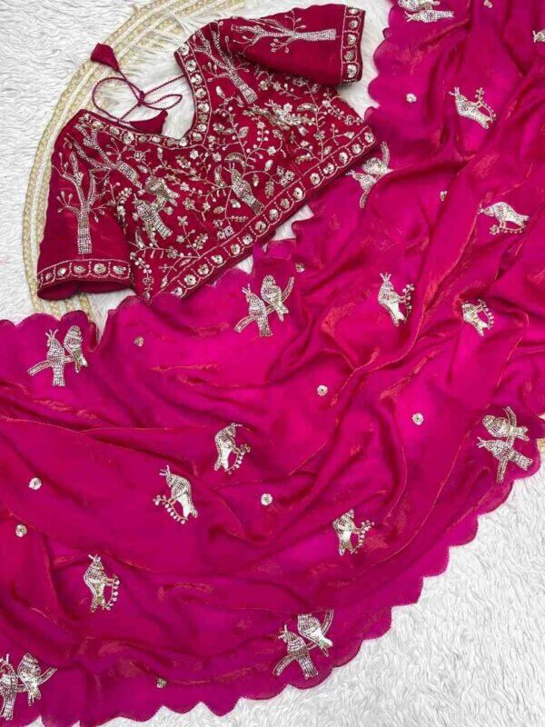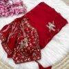 Step into luxury with this exclusive satin saree, crafted from high-quality Fandy Satin fabric. Designed with intricate Khatli Brits work and finished with an all-over Arco Border, this saree is the definition of glamour and sophistication.
