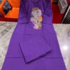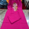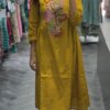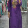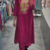 The kurti features a graceful flare with heavy handwork and original embroidery on the yoke, paired with a matching 38-inch palazzo and a 2-meter dupatta for a complete festive-ready style.