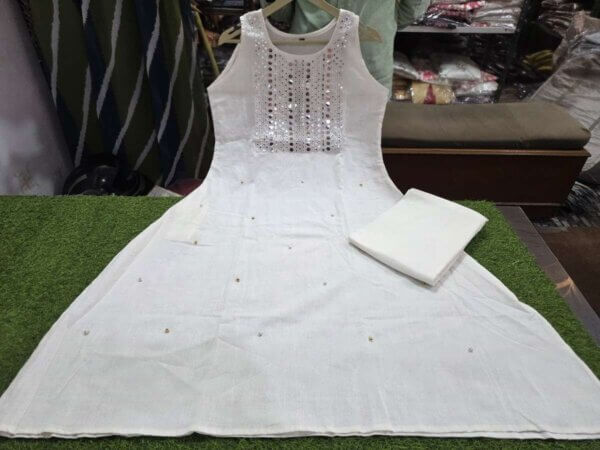 Introducing one of the most beautiful and elegant cotton flex co-ord sets designed especially for gorgeous ladies who love comfort with style. This outfit features a sleeveless kurta with stunning heavy mirror embroidery work, giving you a classy and fashionable summer look. Sleeves are included inside for optional use.