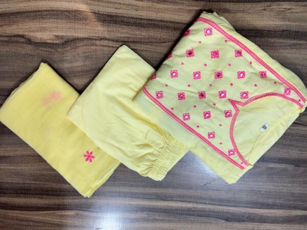 Step into elegance with our Premium Cotton Taj Suit Set, designed with intricate hand embroidery and mirror work that makes it a true masterpiece. This 3-piece set includes a stylish kurta with yoke embroidery, matching bottoms, and a full-length cotton dupatta for the perfect ethnic look.