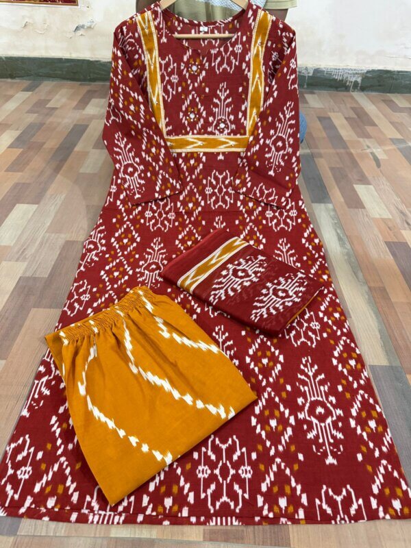 This set includes a matching 100×100 cotton dupatta that completes your ethnic look with grace and charm. Fully stitched and available in multiple sizes, it ensures a perfect fit and effortless style.