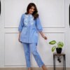 The top features elegant embroidery work, perfectly paired with matching embroidered pants that come with two side pockets for extra comfort. This chic coord set is versatile enough to be styled for both festive outings and casual gatherings.